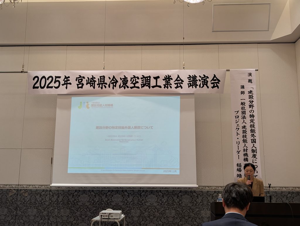 2025年11月21日(金)ニューウェルシティ宮崎にて 一般社団法人 建設技能人材機構 事業部 プロジェクトリーダー 稲場 靖惠 様に 「建設分野の特定技能外国人制度について」と題して講演をして頂きました。