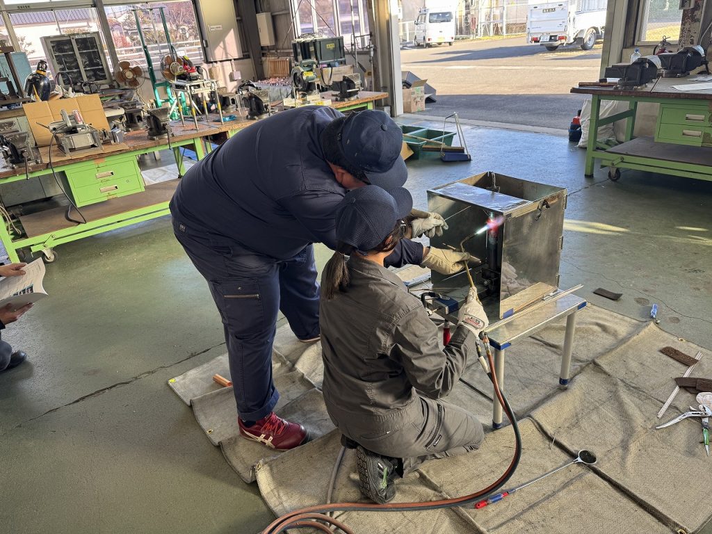 令和8年1月10日 ポリテクセンター宮崎(宮崎市大字恒久4241番地 ℡0985-51-1511)にて銅管フレア加工・ろう付技術講習会を実施しました。 〇講習会カリキュラム 座学 フレア加工・ろう付要領DVD 実習① フレア加工、気密試験 実習② ろう付Φ31.75+ソケット、切断評価 実習③ ろう付Φ31.75+チーズ、切断評価 実習④ CO2配管ろう付Φ19.05+ソケット、切断評価 実習⑤ 遮蔽板有りろう付Φ31.75+ソケット、切断評価